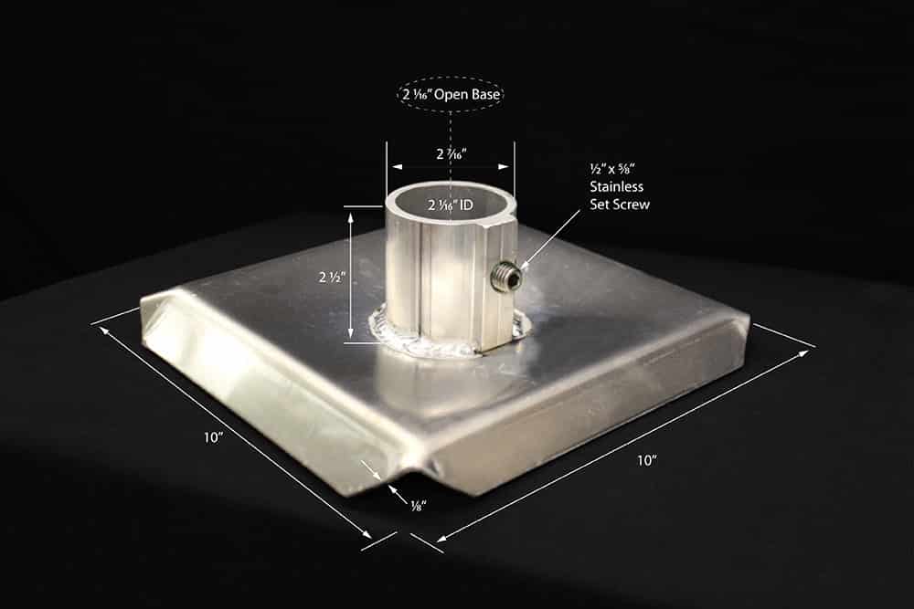 Dock Pipe Leg Foot with a set screw for vertical adjustment. Pipe can pass through the foot into the ground while the foot prevents the leg from pushing deeper when weight is added. Dock feet are not always needed on rocky lake bottoms but more commonly used on mud and sand. Foot plate size is 9.5″ x 9.5″
