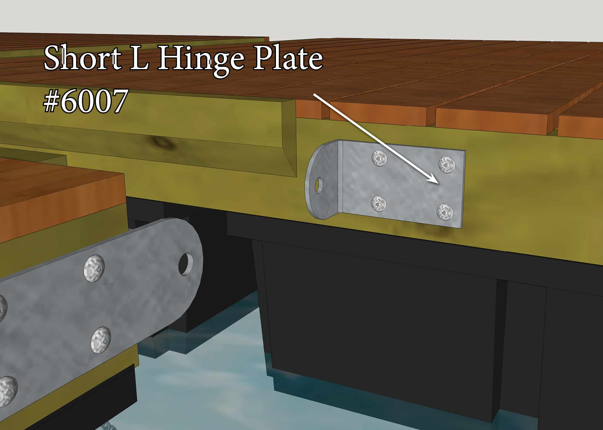 Short L Hinge plate is for joining floating docks together. The plate works similar to the T-Hinge plate however may have a bolt pattern that works better if framing or hardware interferes with mounting bolt locations. Corner Irons should be used to reinforce the wood stringer this is mounted to so it doesn’t pull apart.
