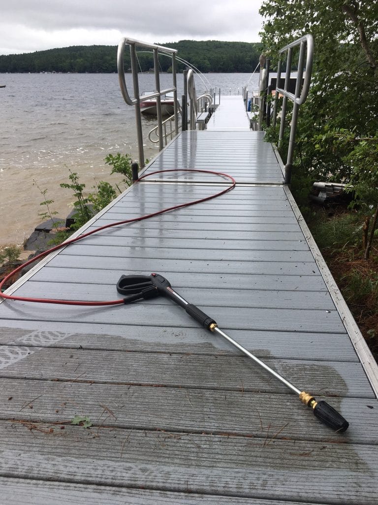Sap, mildew, and dirt are easy to remove from synthetic decking with a power washer. Storing decking in frames often protects the sections underneath, minimizing the cleaning needed before reinstallation.
